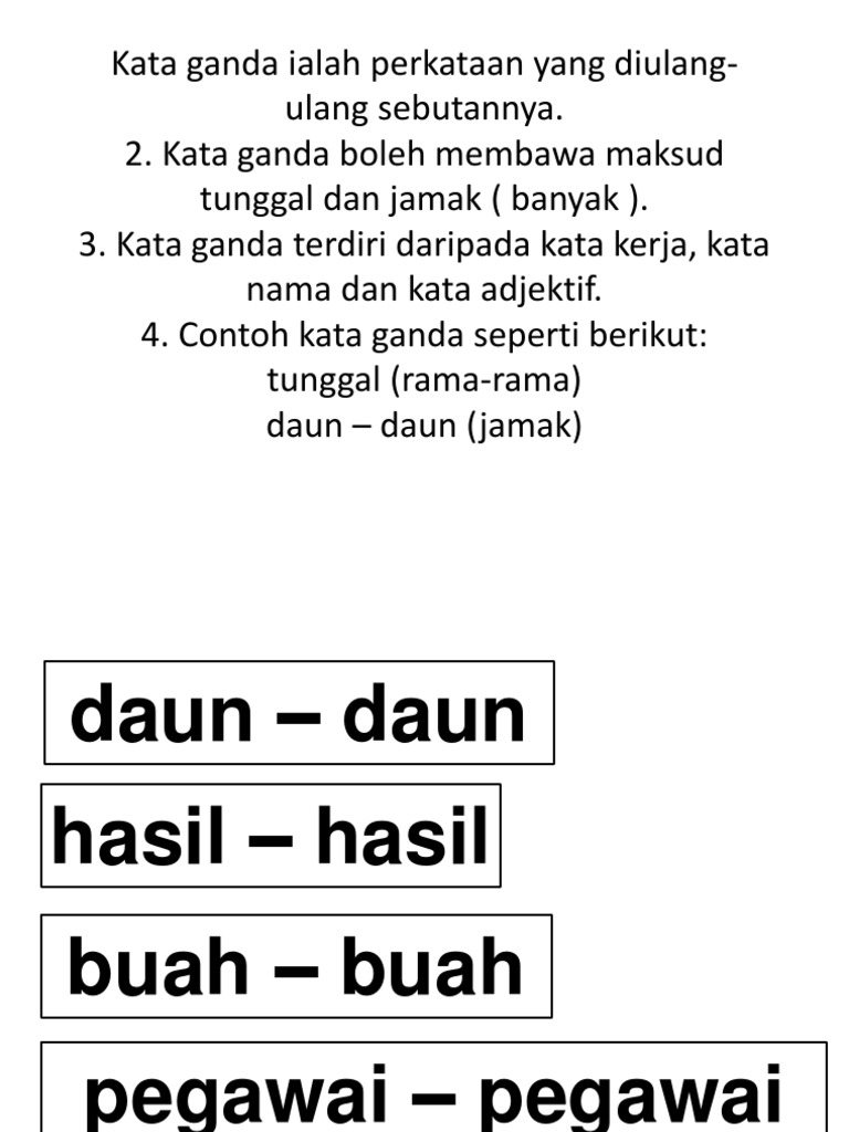 4 SM sampai 3033 M. G-17040847 menerbitkan MODUL PRAKTIS BAHASA MELAYU KERTAS 2 pada 2021-07-04. Kata Ganda Separa Kata ganda separa mengalami pengulangan suku kata pertama pada kata asalnya.